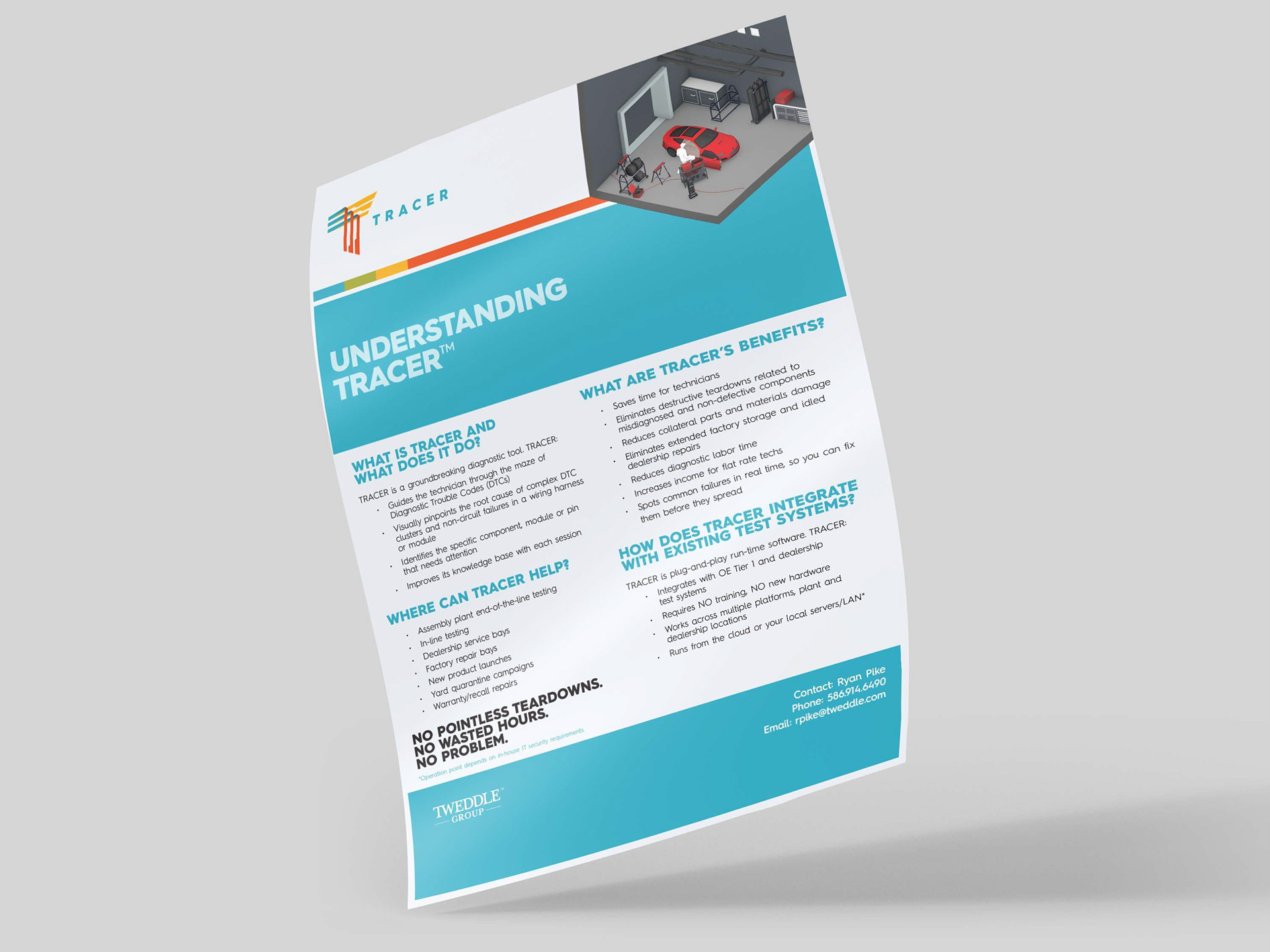 After initial research (automotive technology landscape, customer need, product attributes) concepts were presented to gain interdepartmental alignment and iteration proceeded on the selected direction. Collaborated with designers and copywriters for content, Tracer’s business development team to determine outcomes and positioning, as well the product development team to solidify strategy for implementation and identity. The resulting direction centers on the future of automotive vehicle wiring. TRACER is now in use at automotive facilities across the nation.